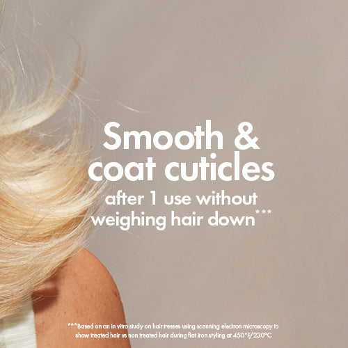 ***Based on an in vitro study on hair tresses using scanning electron microscopy to show treated hair vs non treated hair during flat iron styling at 450°F/230°C
